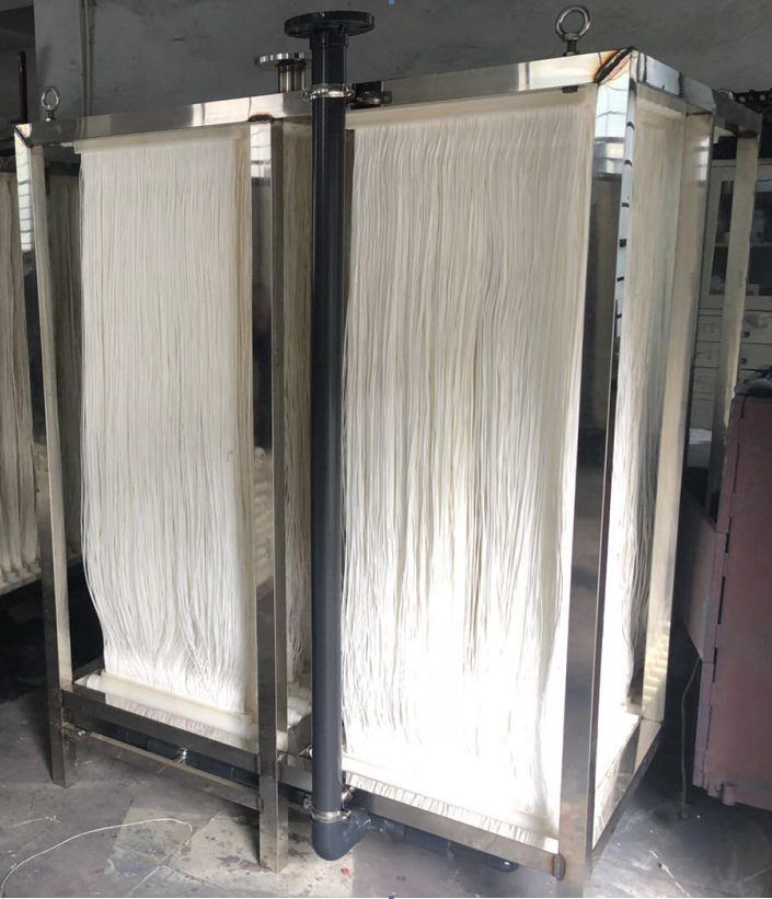9、 膜組件設有曝氣管,對膜絲進行氣水沖刷,維護膜的通量,也可利用生化池的曝氣過程對膜纖維表面進行清洗,保持穩(wěn)定的產水量。